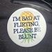 This quirky pin button features an upside-down pineapple design with the phrase 'I'm bad at flirting, please be blunt' in blue. Perfect for adding a touch of humor to your outfit or accessories. Ideal for those who appreciate unique and fun accessories. Great for occasions such as Valentine's Day, parties, or casual days out.